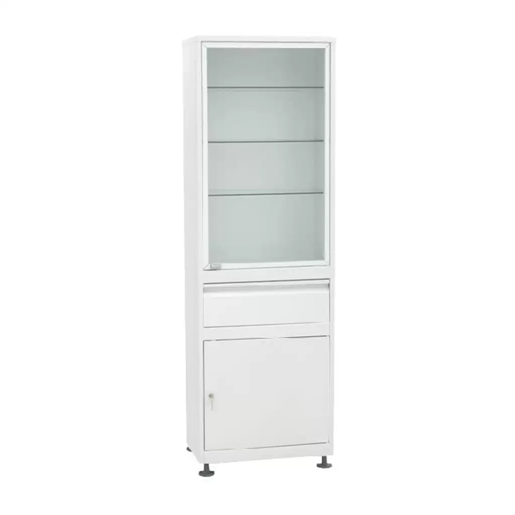 Шкаф ШМС-1-А-Р-1 (ШМС-1 в алюминиевой раме с регулируемыми опорами с ящиком) предназначен для размещения и хранения лекарственных средств, перевязочных материалов и других медицинских изделий.