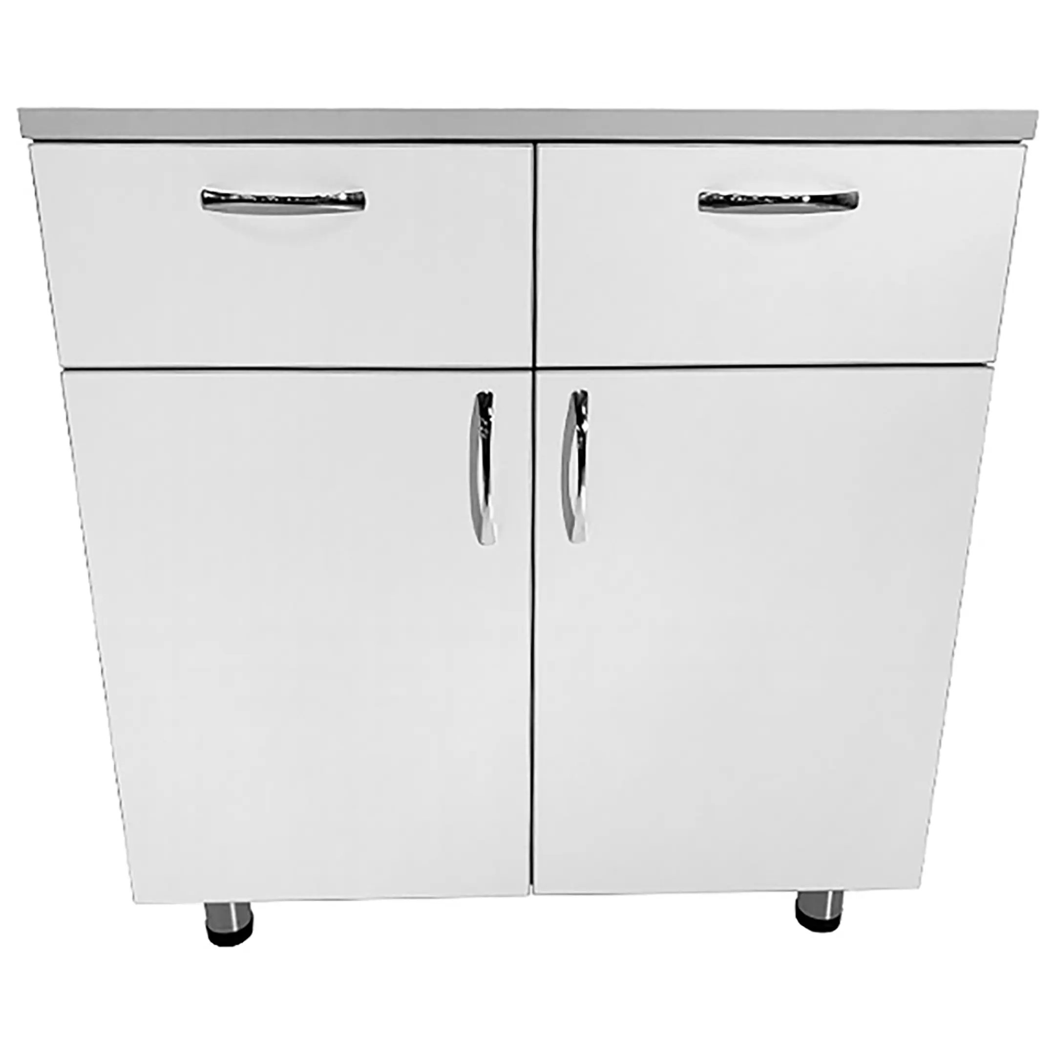• Для удобства использования предусмотрены хромированные ручки-скобы размером 96 мм (4 шт.), а также кромка ПВХ 2 мм для столешницы и 0,4 мм для остальных частей, обеспечивая безопасность и долговечность конструкции.