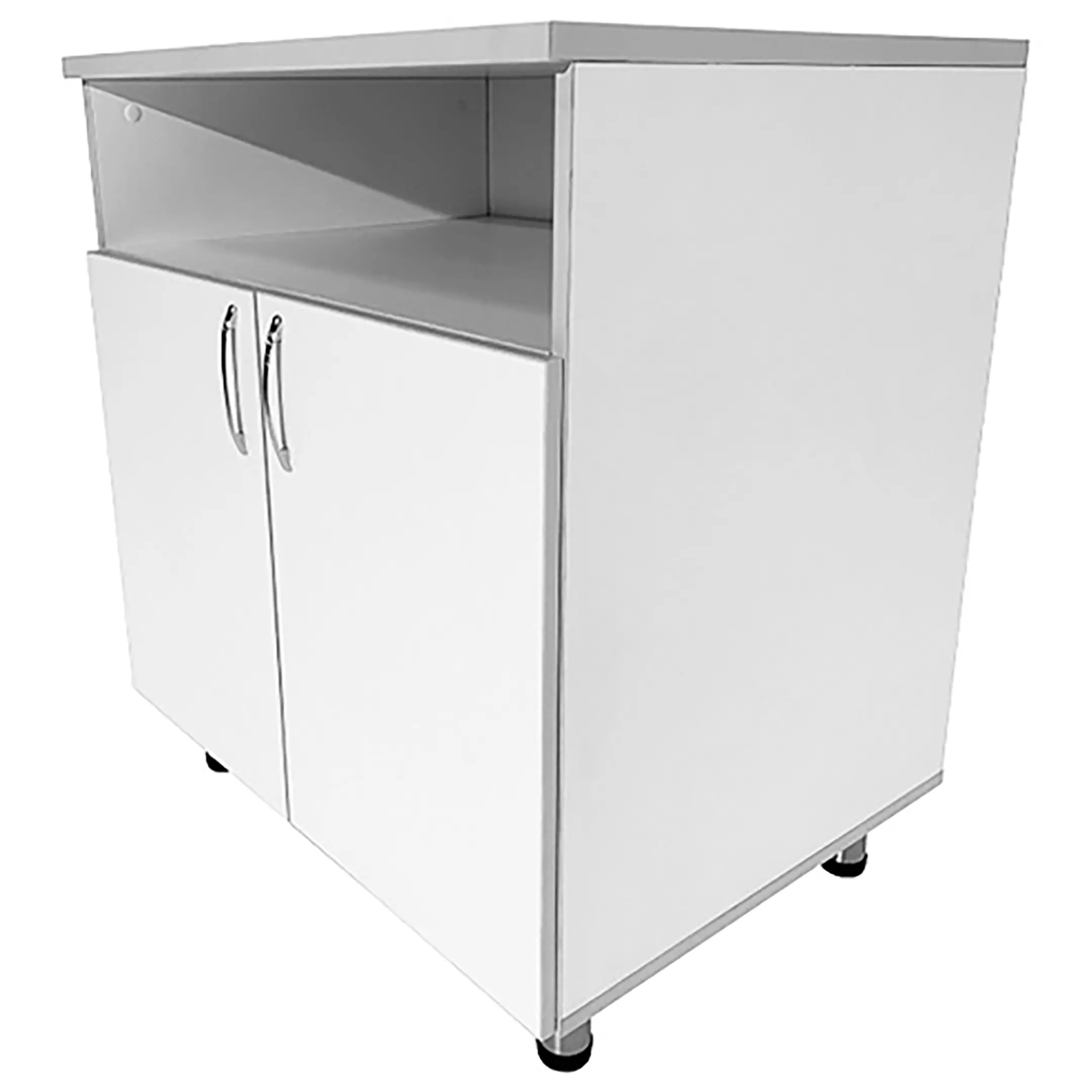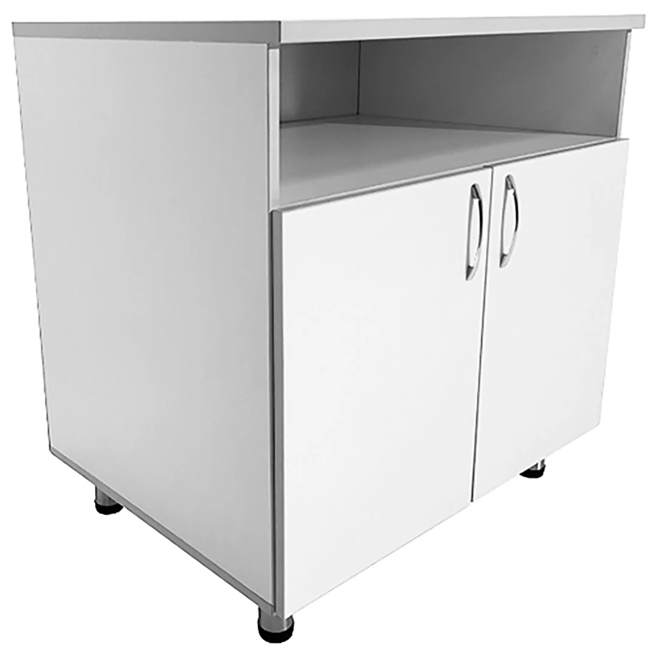 • Многофункциональное пространство для хранения: Под столешницей тумбы расположены большая ниша и вместительное отделение с двумя распашными дверками и полкой внутри. Это позволяет удобно организовать хранение различной медицинской аппаратуры и предметов.