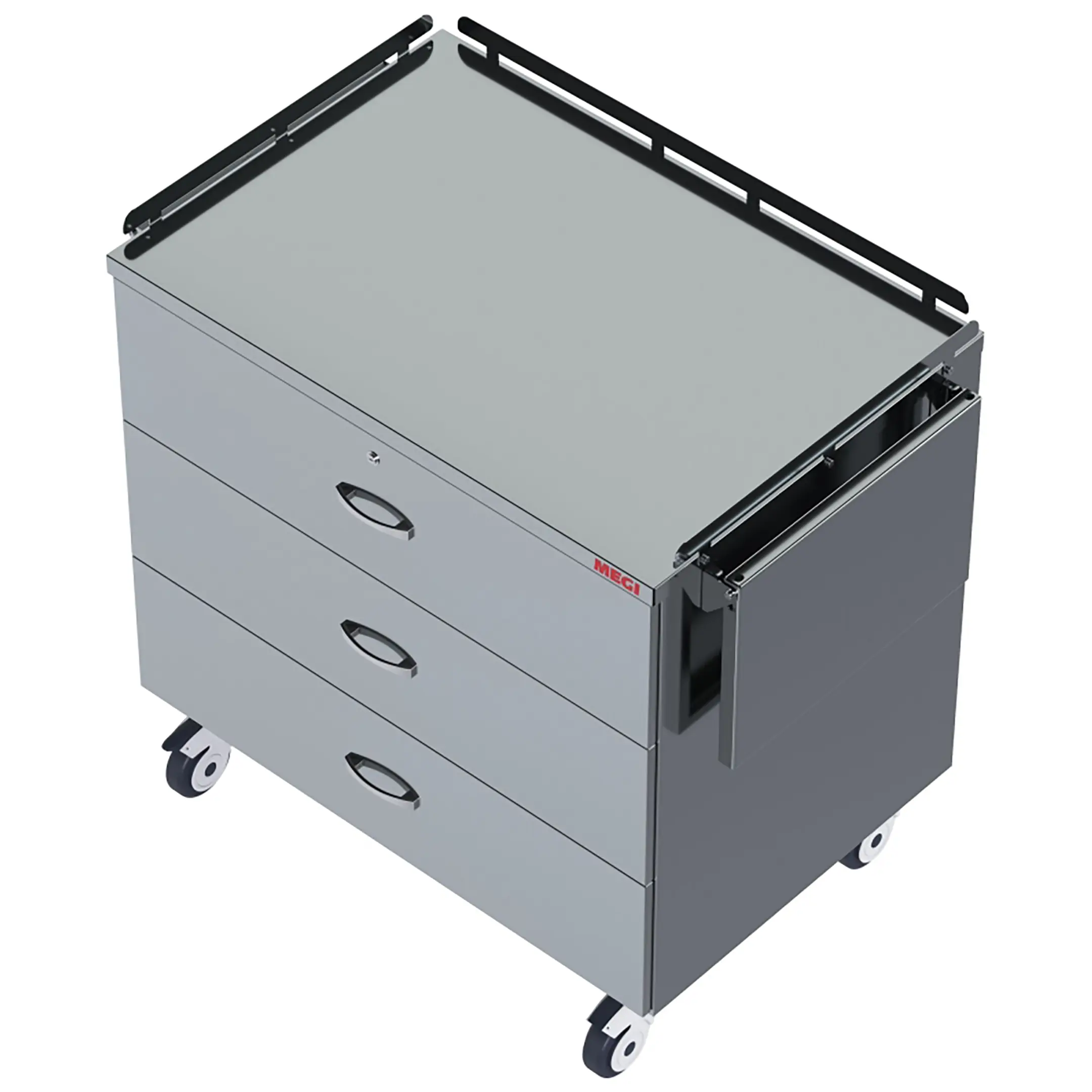 • комплектуется боковой ручкой для удобного перемещения и ограждениями по трем сторонам периметра столешницы;