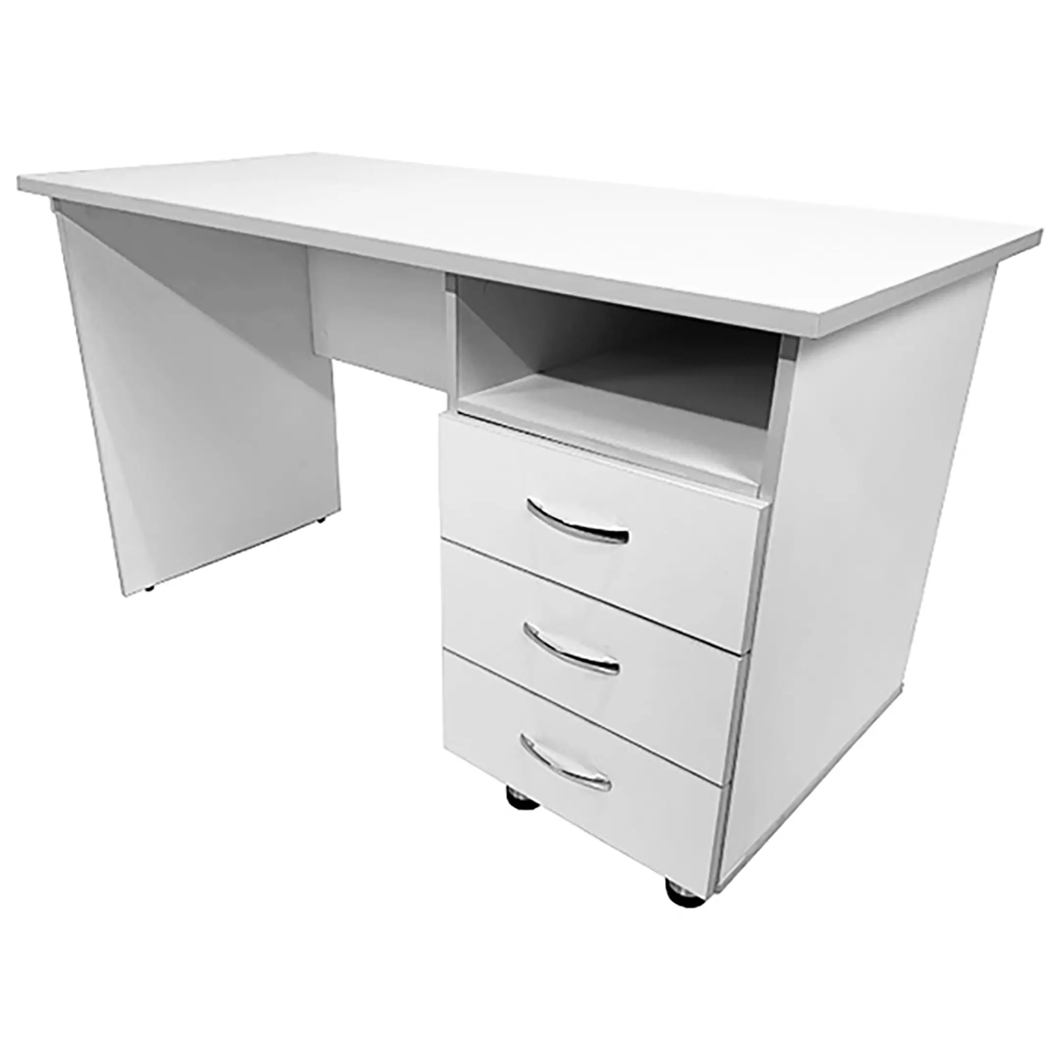 • Стол оснащен боковой тумбой, которая оборудована нишей и тремя выдвижными ящиками.