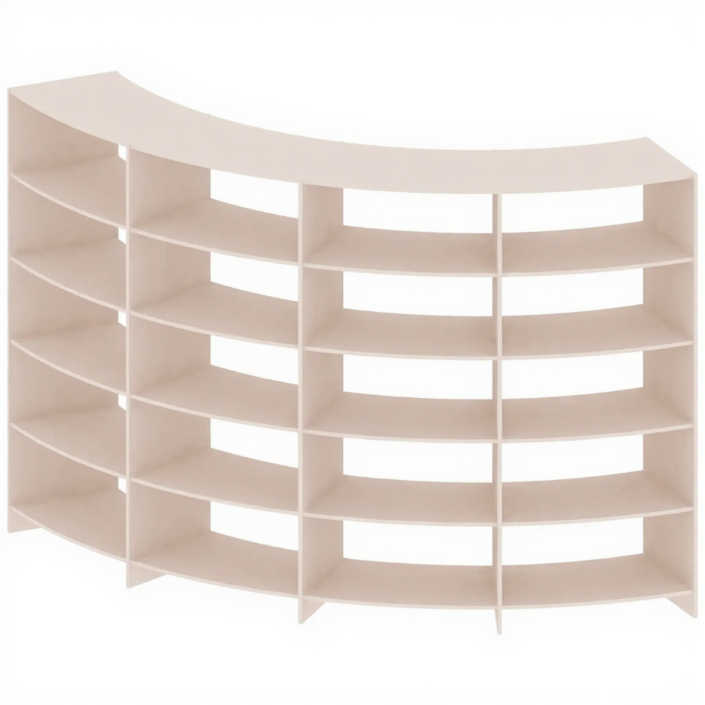 - Эргономичная и безопасная форма — отсутствие острых углов делает стеллаж безопасным для использования в помещениях с высокой проходимостью, особенно в детских учреждениях, и создает плавные линии в интерьере.