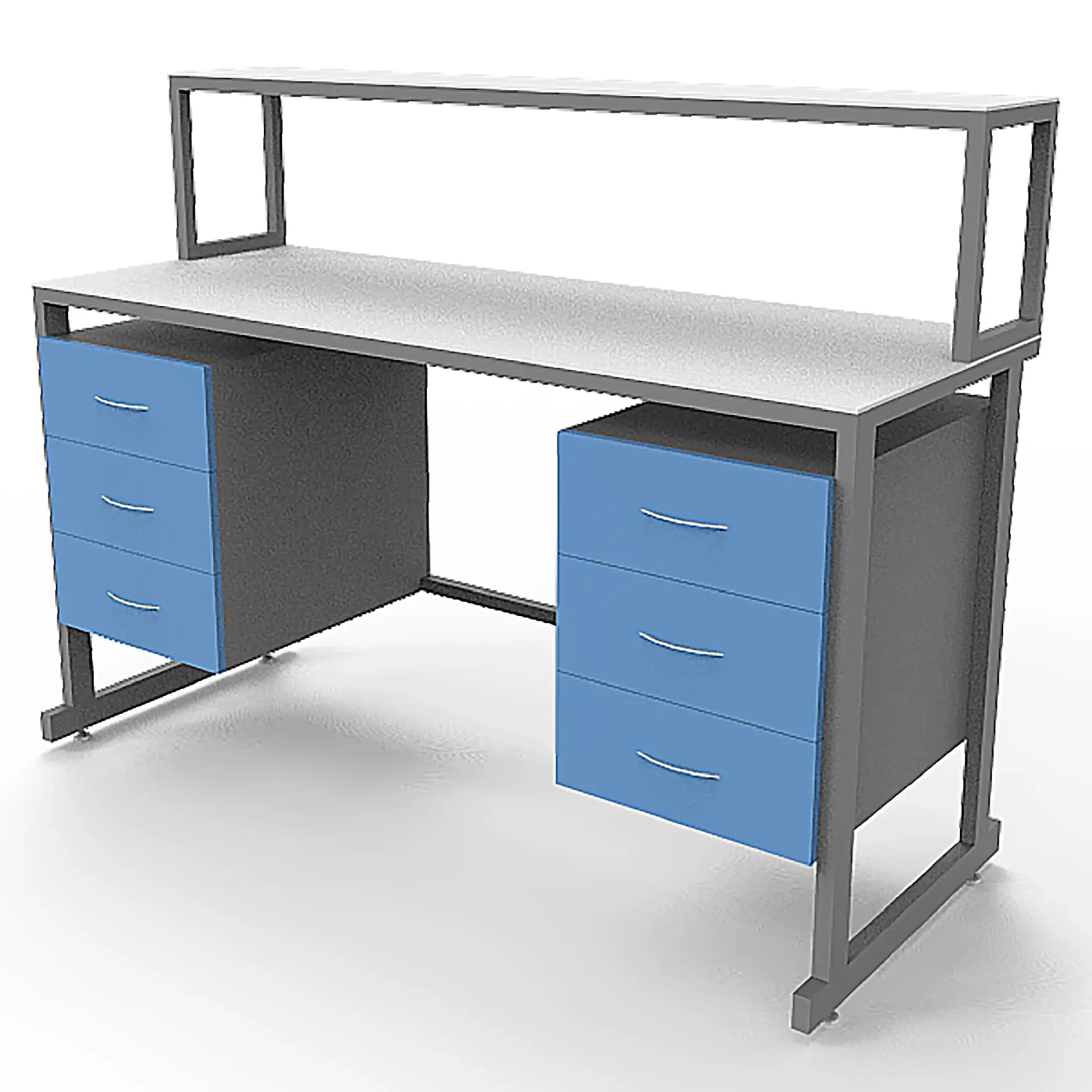 - Вместительная система хранения — две тумбы под столешницей, каждая с тремя выдвижными ящиками (всего 6 ящиков), и надстройка с полкой.