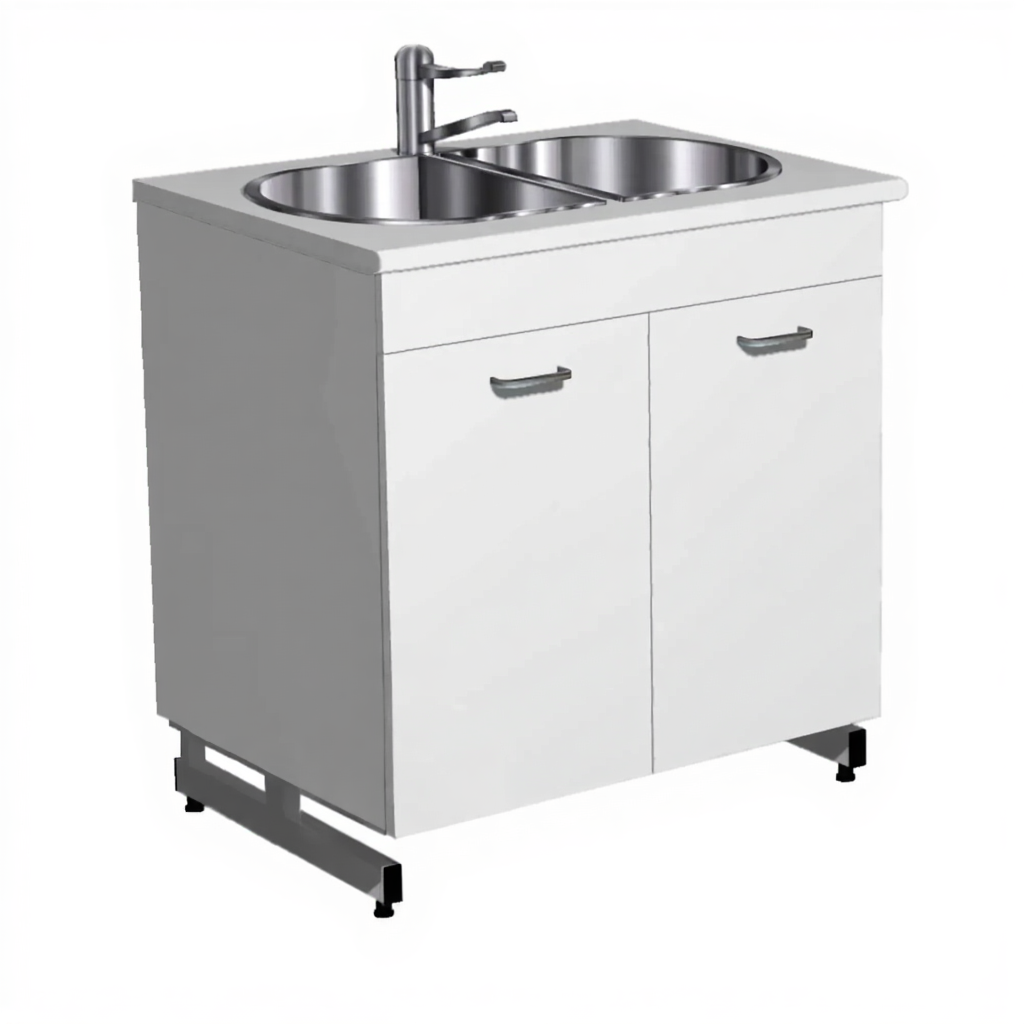 - Двухчашевая мойка из нержавеющей стали — врезная, устойчива к коррозии и механическим повреждениям, комплектуется локтевым смесителем.