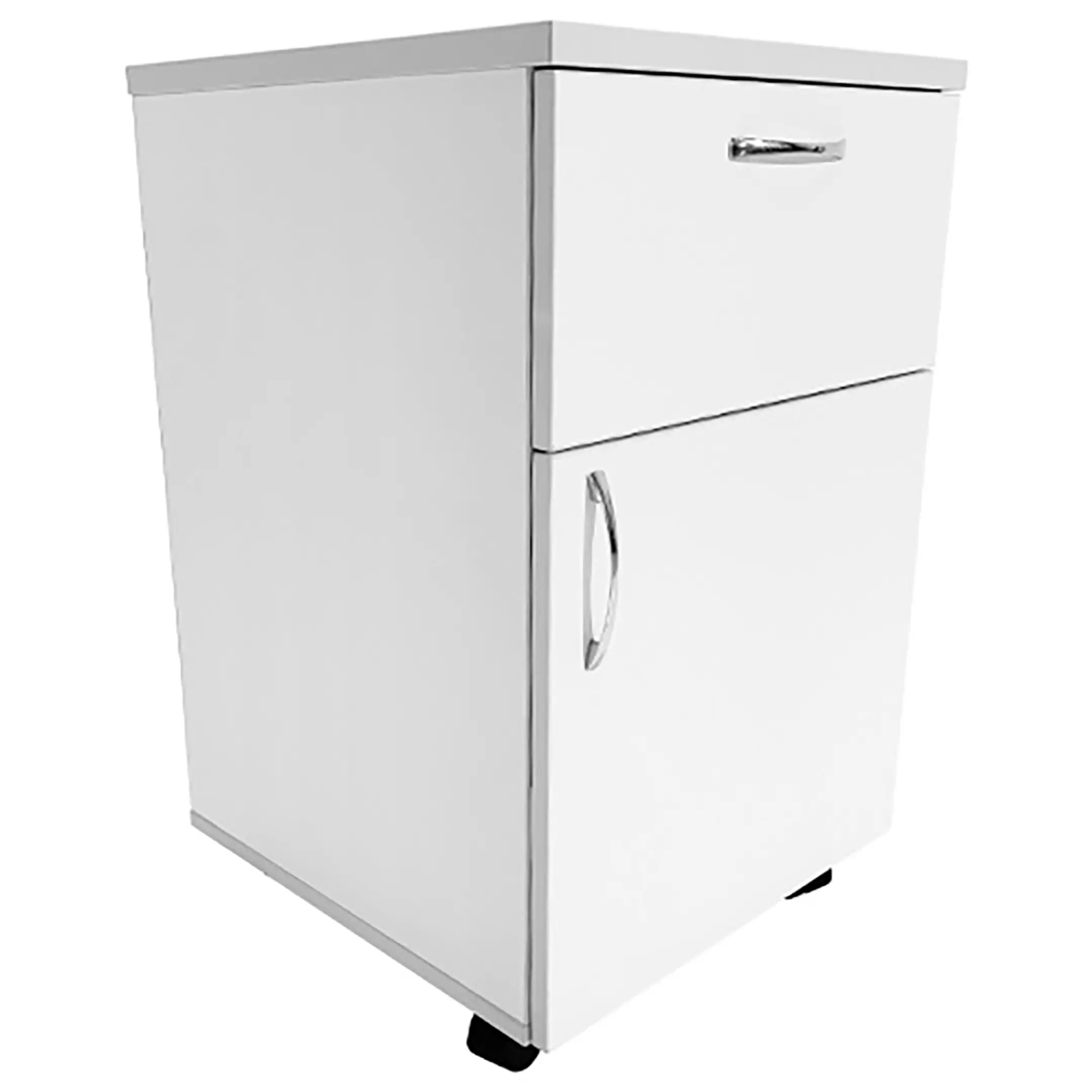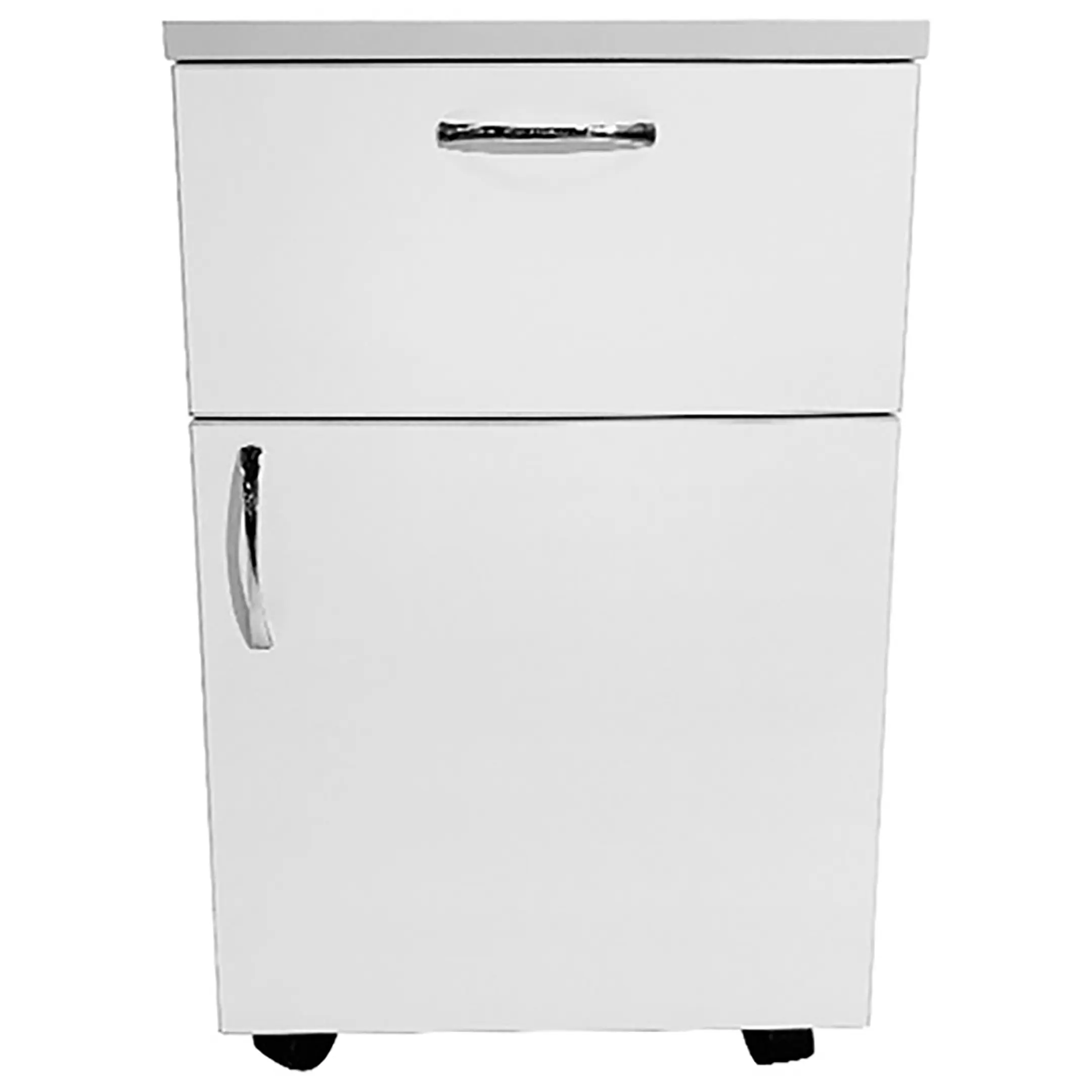 - Легкость перемещения — пластиковые ножки с колесными опорами диаметром 50 мм позволяют легко перемещать тумбу и фиксировать ее в нужном положении.