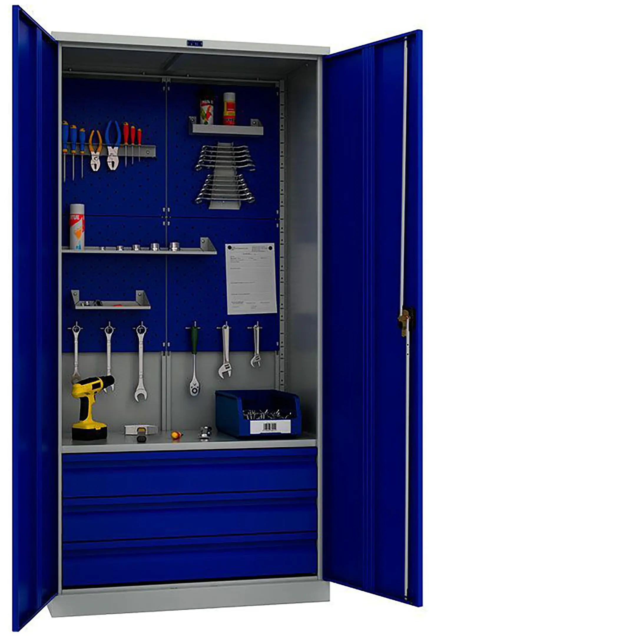 - Максимальная организация и наглядность — модель оборудована обширными перфорированными панелями (система «перфо») на дверцах и, как правило, на задней стенке. Это позволяет удобно, компактно и наглядно разместить огромное количество инструмента на крючках и держателях, обеспечивая мгновенный визуальный контроль его наличия и комплектности.
