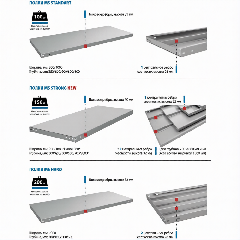 - каждая полка усиливается 1 центральным ребром жёсткости высотой 26 мм;