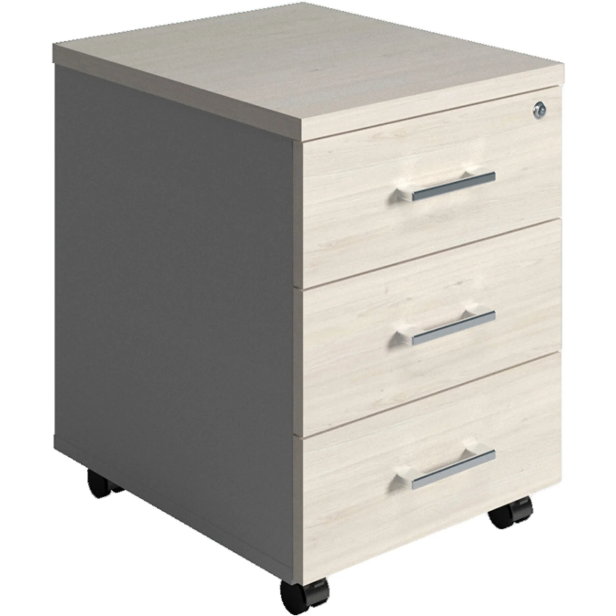 • тумба снабжена центральным замком и оснащена пластмассовым лотком для канцелярских принадлежностей в верхнем ящике