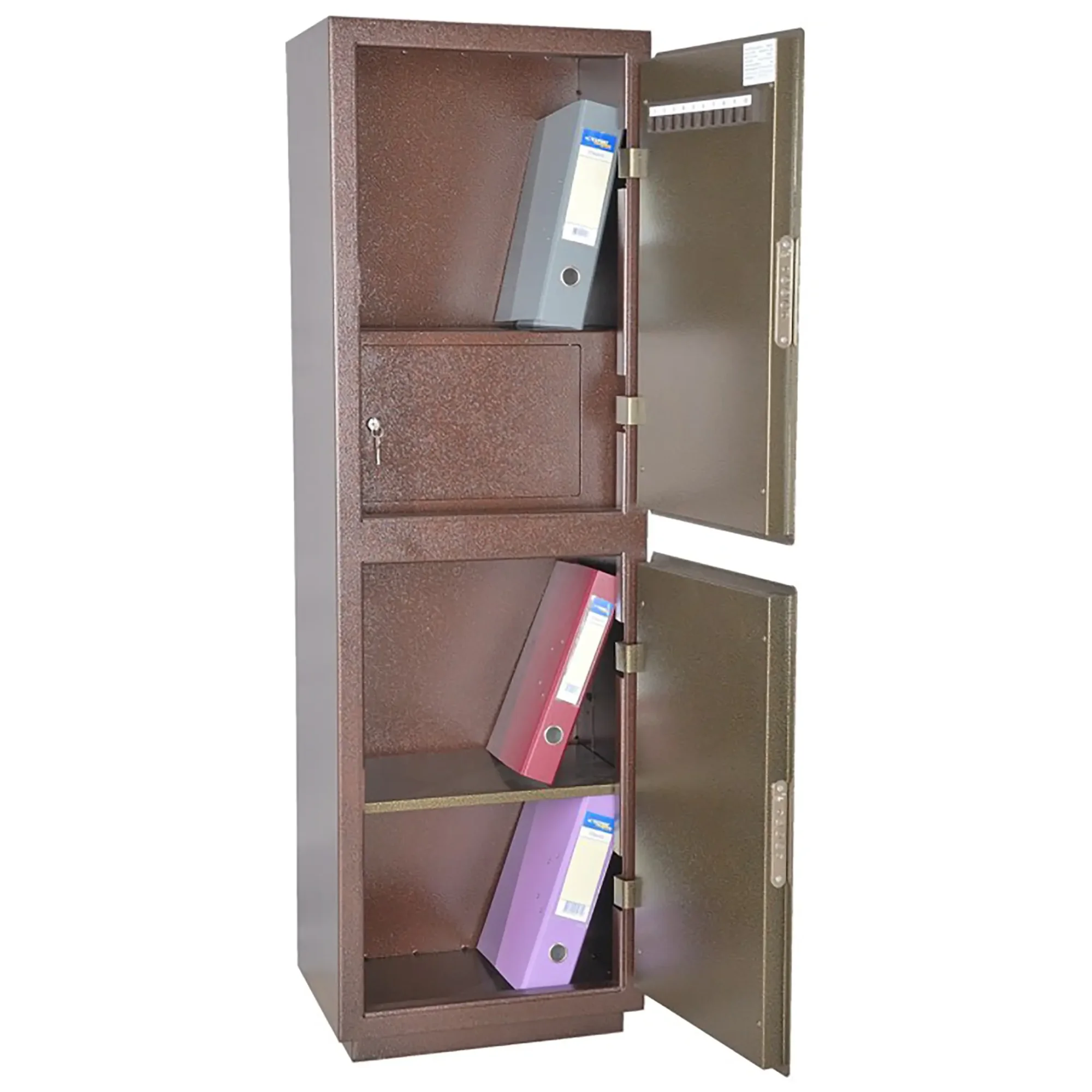 • Сейф двухсекционный, оснащен одной съемной полкой и трейзером.