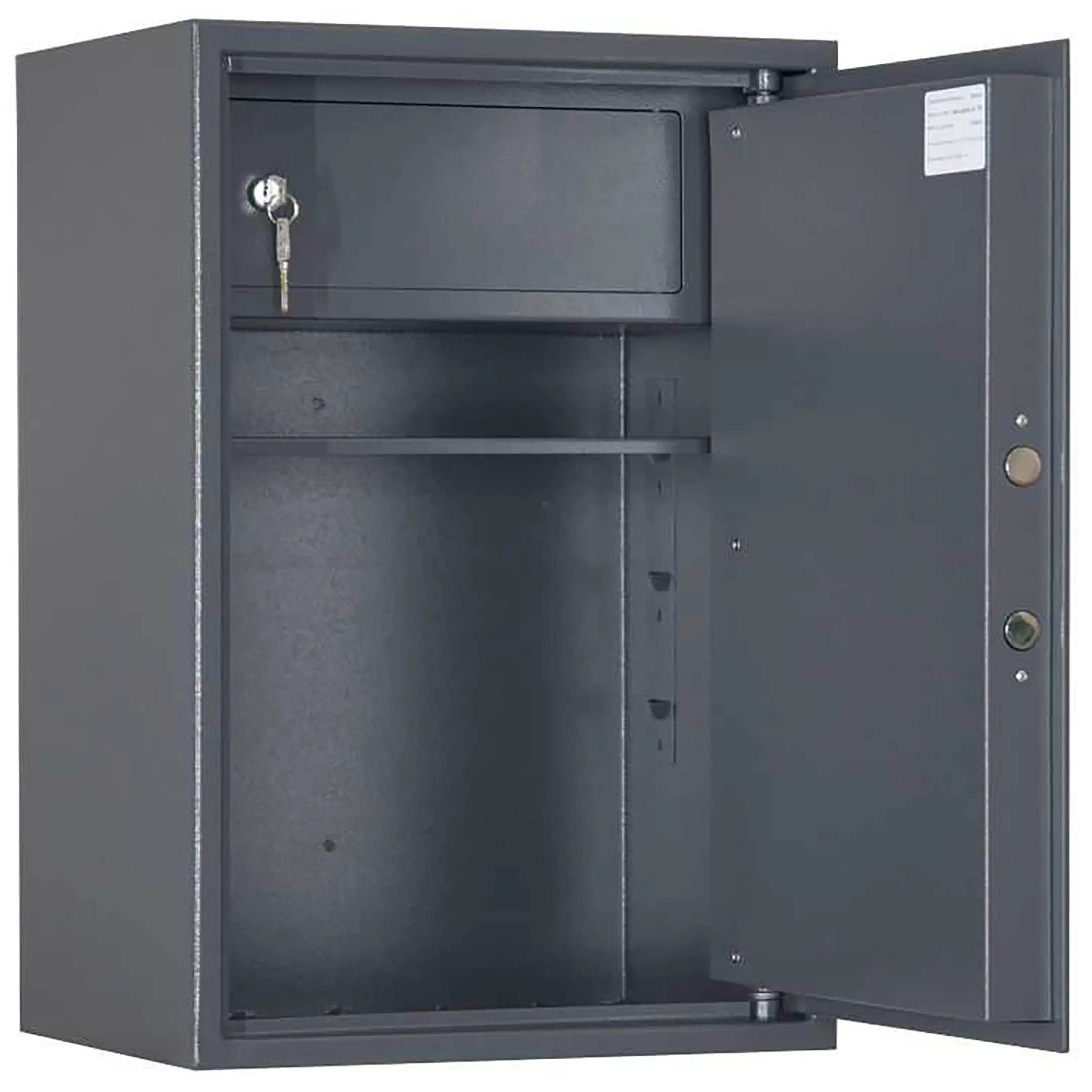 - Сейф односекционный, оснащен одной съемной полкой и трейзером.