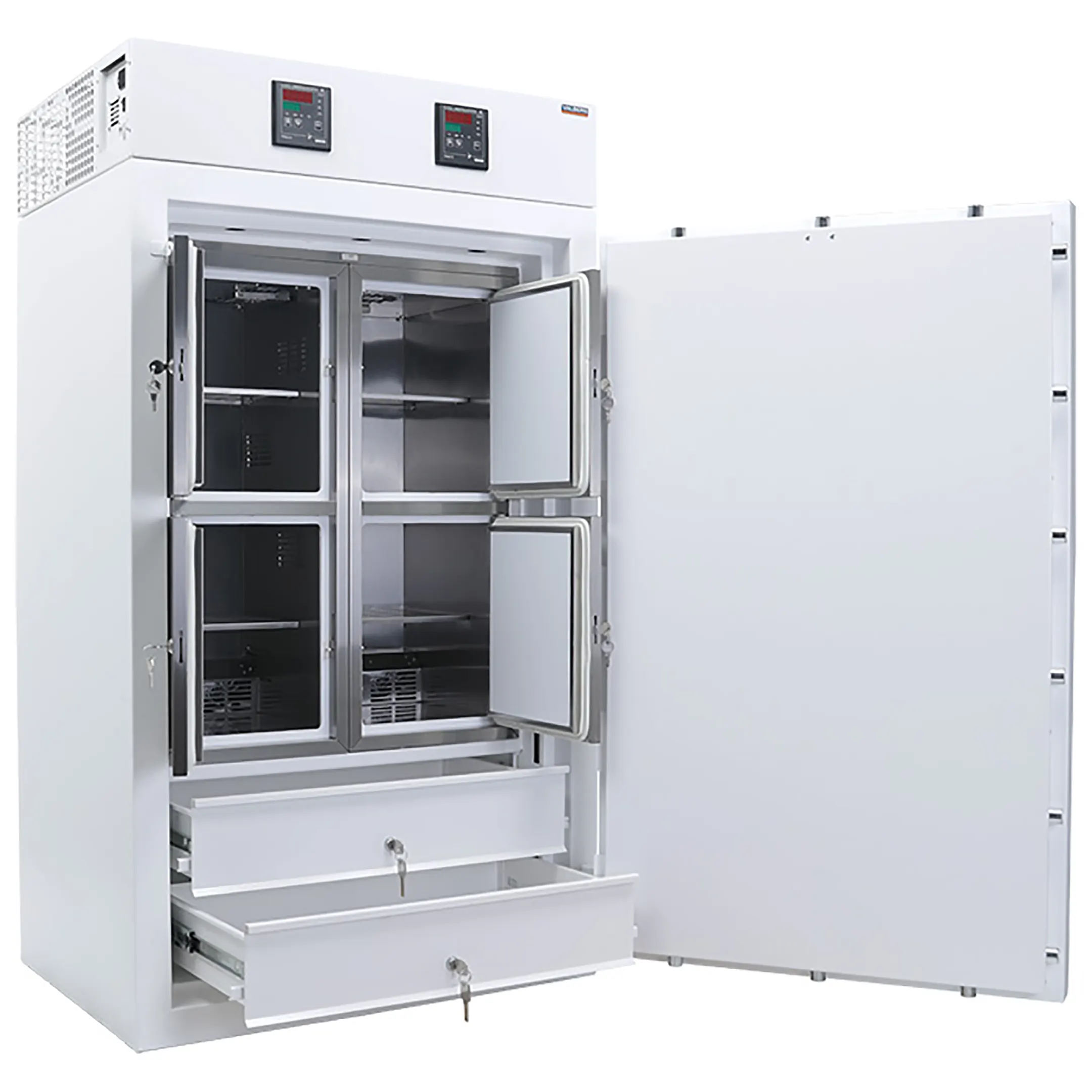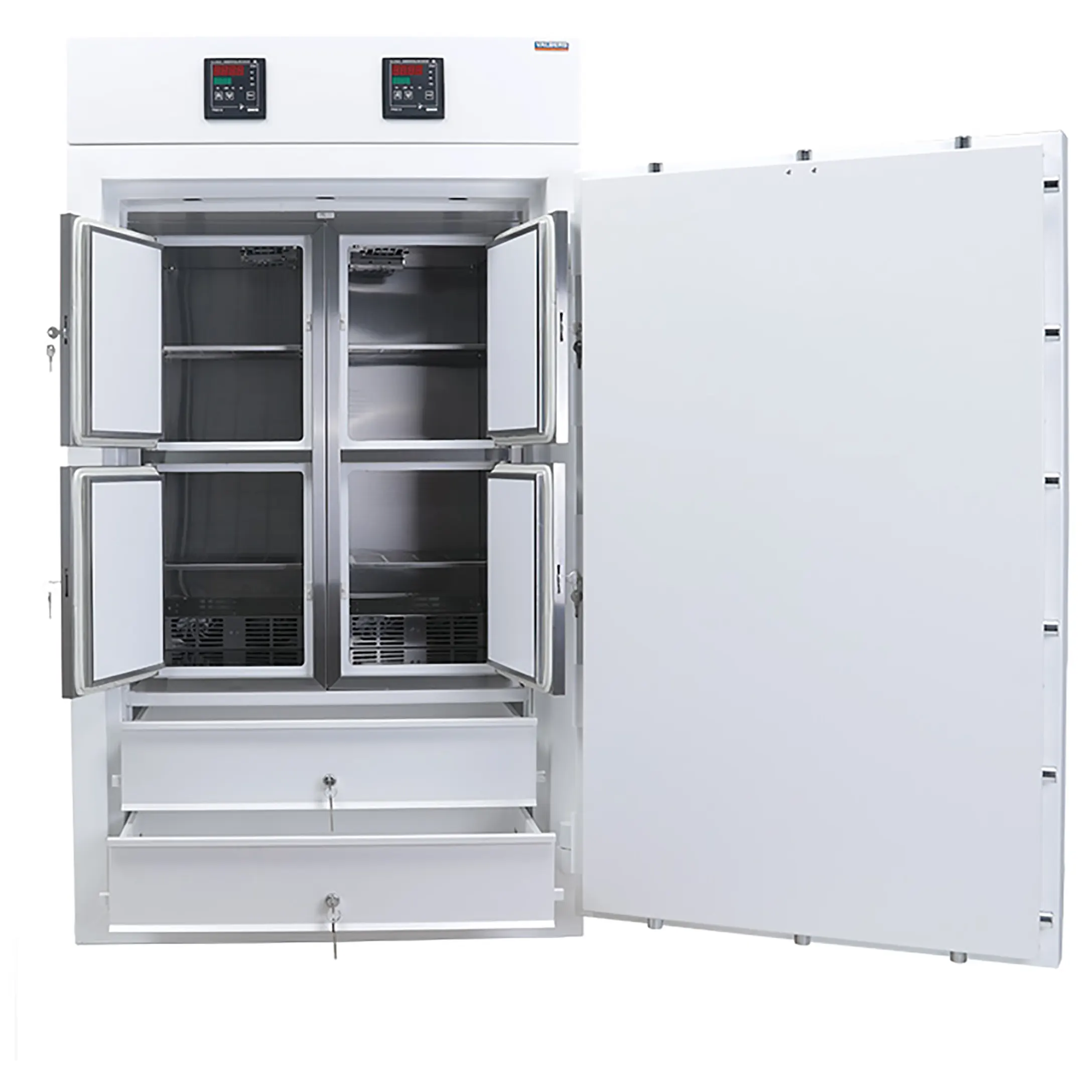 - Двумя выдвижными, индивидуально освещаемыми и запираемыми 32-ух литровыми ящиками без обеспечения тепловых режимов хранения