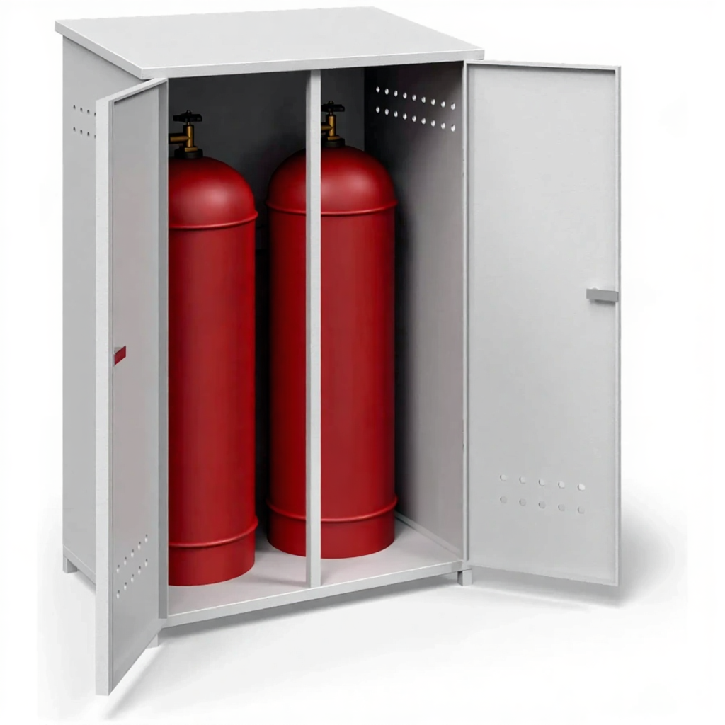 - Удобство для эксплуатации и эргономика — несмотря на массивность, конструкция продумана для удобства: широкая дверца обеспечивает легкий доступ для установки, замены баллонов и обслуживания оборудования. Шкаф рассчитан на надежное настенное или стационарное напольное крепление.