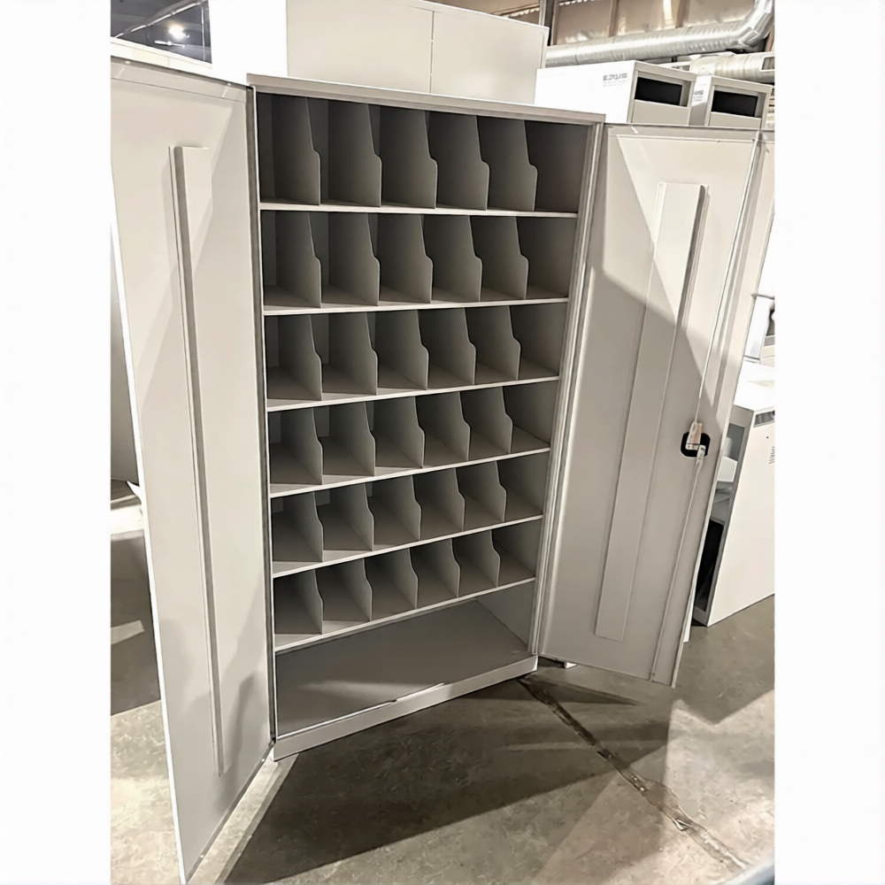 • Свободная нижняя ниша - высота 275 мм. Две дверцы, скошенные полки для удобства хранения СИЗ.