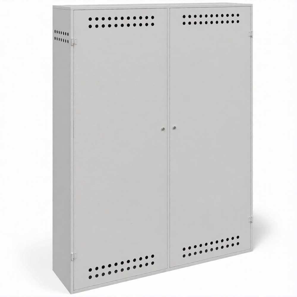 - Обеспечение требований пожарной безопасности — усиленный металлический корпус служит надежным барьером, изолируя баллоны от возможных источников возгорания, искр и тепла. Наличие системы естественной вентиляции (перфорация или вентиляционные решетки) предотвращает образование взрывоопасной концентрации газа в случае утечки, что строго соответствует нормам ППР в РФ.