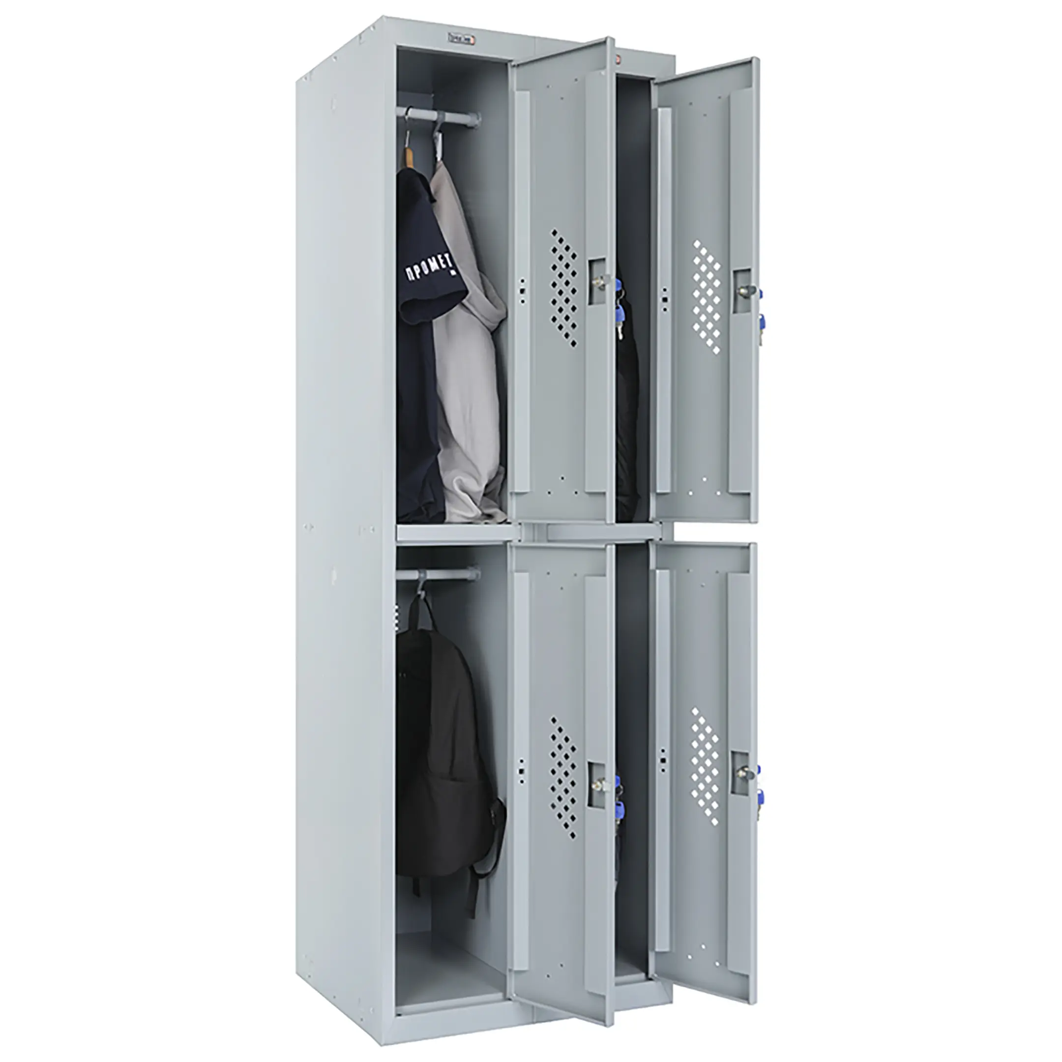 • опции (под заказ, уточняйте у менеджера): замком PL*** (вместо ключевого замка устанавливается бесключевой замок Euro-locks A129 с устройством под навесной замок), кодовый механический или кодовый электронный (по запросу), для камер хранения или фитнес центров; полка под обувь, подставка или скамья-подставка под шкаф, наклонная крыша