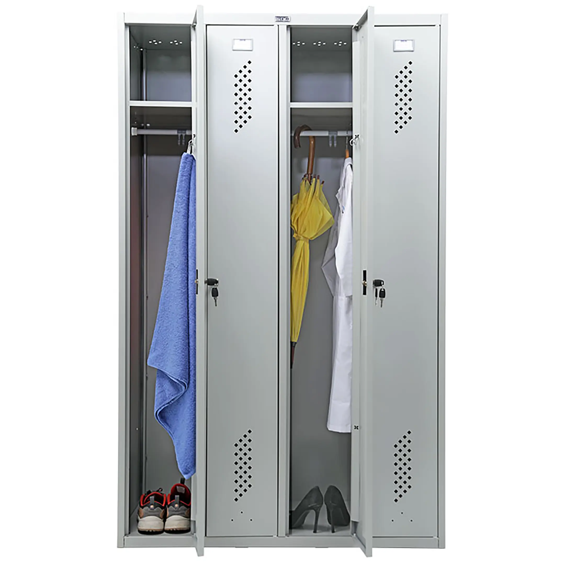 • четыре секции, четыре перекладины для плечиков или сушки полотенец, крючки для одежды или сумок, 4 замка повышенной секретности;