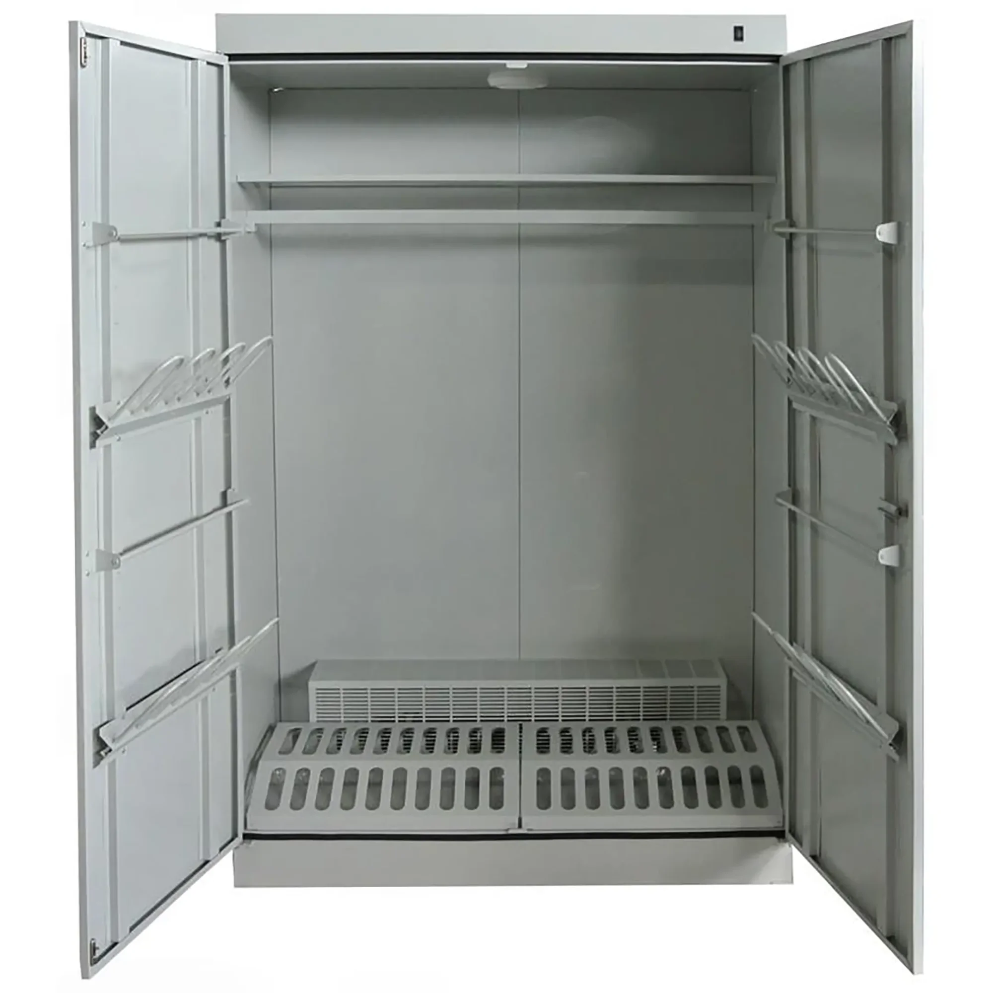 - Эффективная и равномерная сушка — использование жидкого теплоносителя обеспечивает стабильный и равномерный нагрев всего внутреннего объема шкафа. Это позволяет качественно и быстро просушивать различные материалы, включая плотные ткани, обувь и рабочий инвентарь.